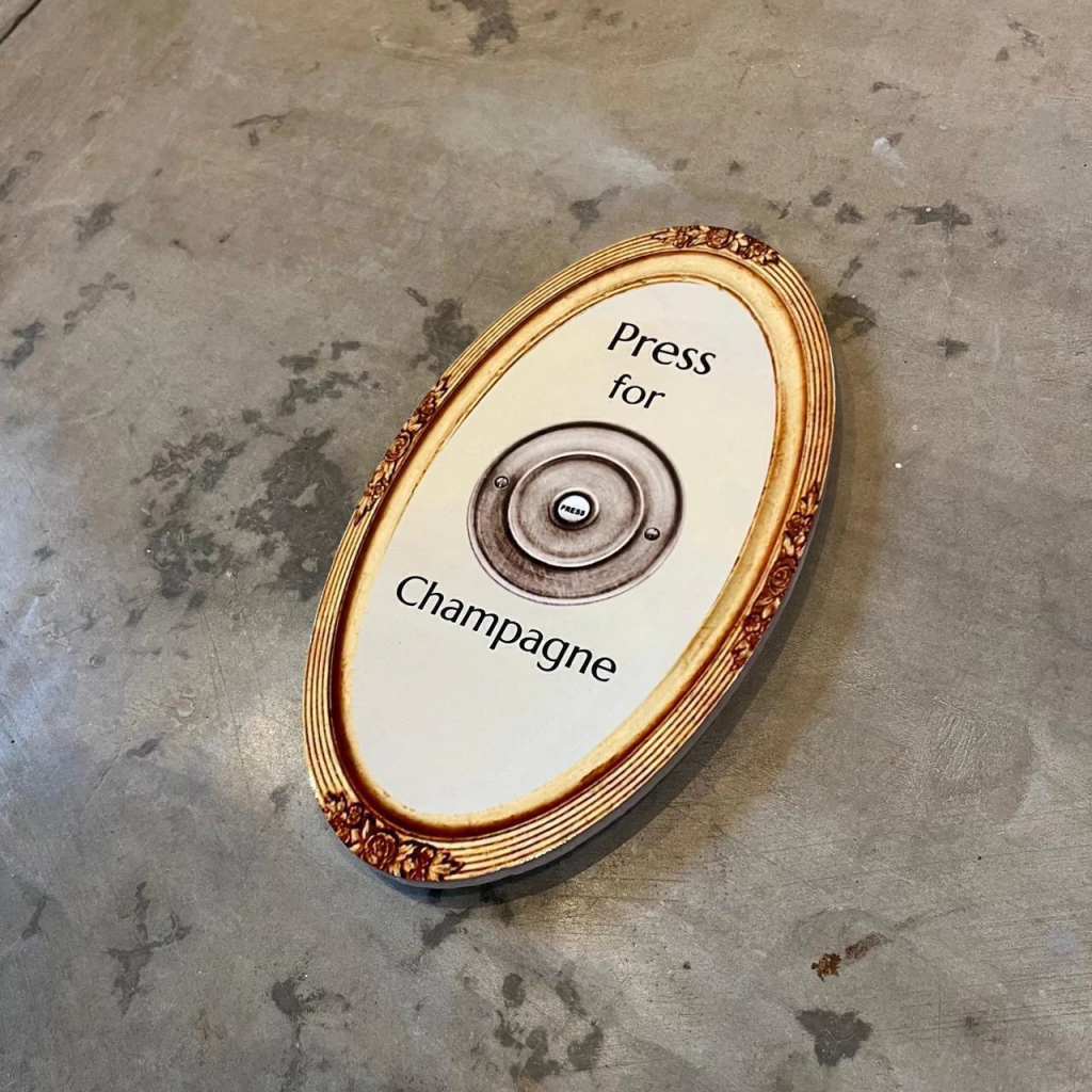 - Azulejo decorativo oval com estampa retrô-contemporânea que lembra uma moldura de campainha com um toque de humor com a frase que lembra o clássico "toca a campainha e saí correndo!", mas agora com a frase "Press For Champagne" , para decorar seu cantinho com arte de ironia e estilo.