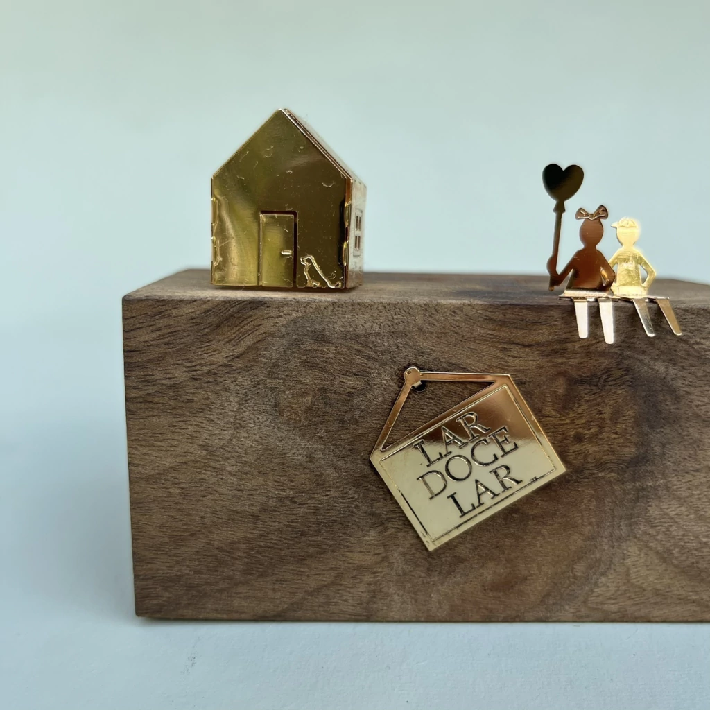 - Bloco de madeira reutilizada, com variações de cor e pequenas imperfeições naturais, com o charme de peças de metal banhado a ouro de um casal ao lado da sua casinha com um cachorrinho gravado e a placa "Lar Doce Lar"