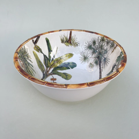 - Bowl Grande em melamina, com estampa tropical e borda de desenho em Bambu.