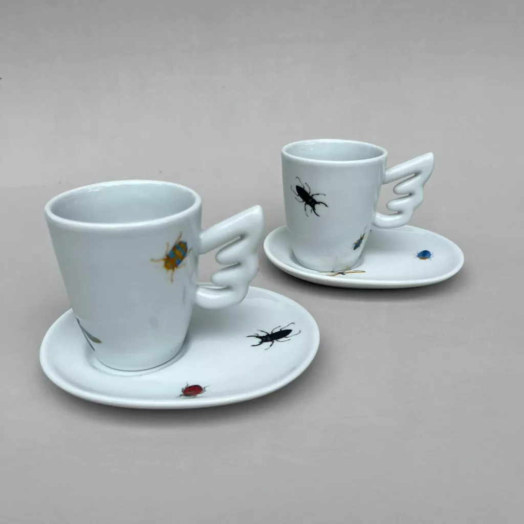 - Duas Xícaras com dois pires de porcelana no formato arredondado, alça no formato figurativo de asas e aplicações com flores, insetos e folhagens coloridas