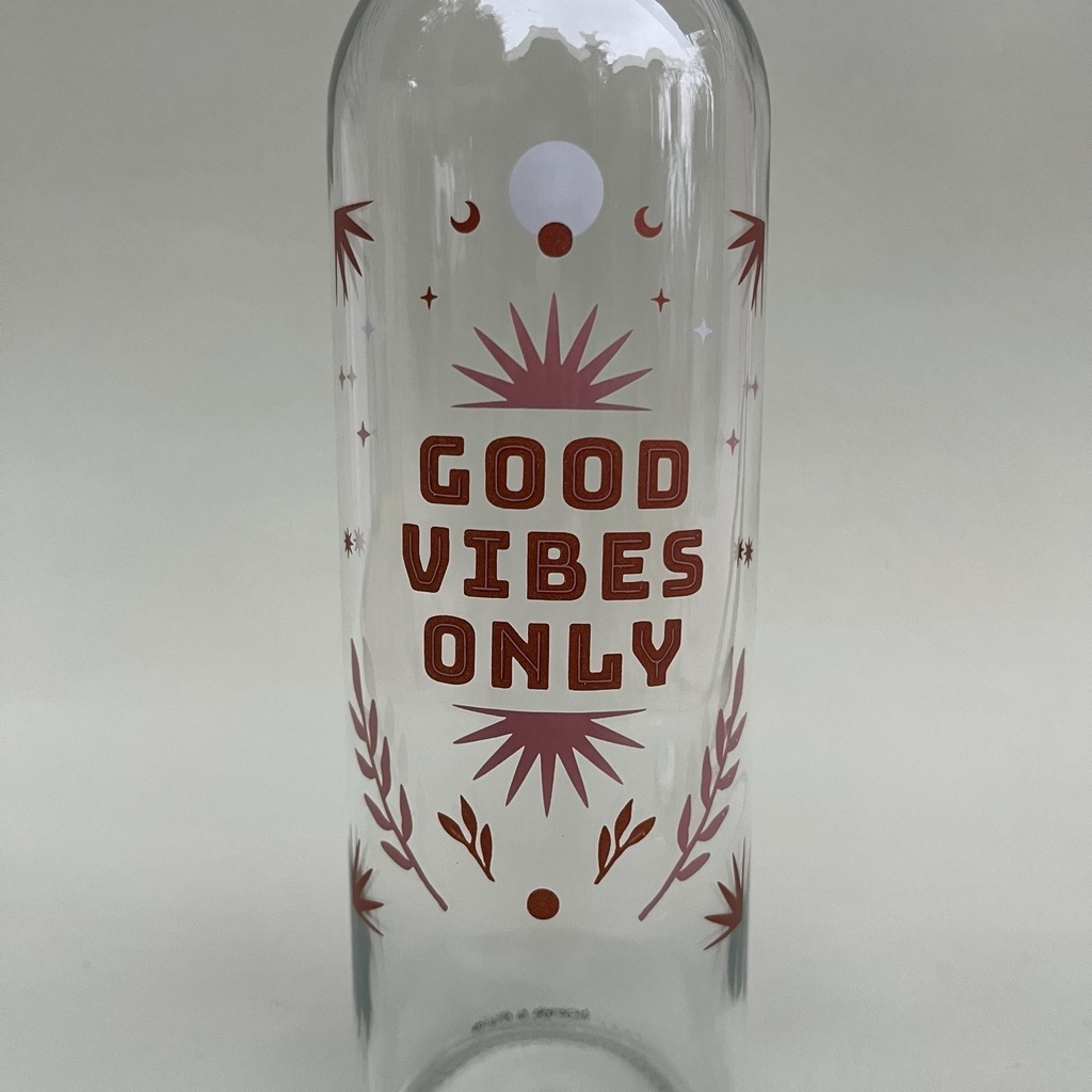 - Garrafa de vidro com estampa "Good vibes only" e com tampa de alumínio.