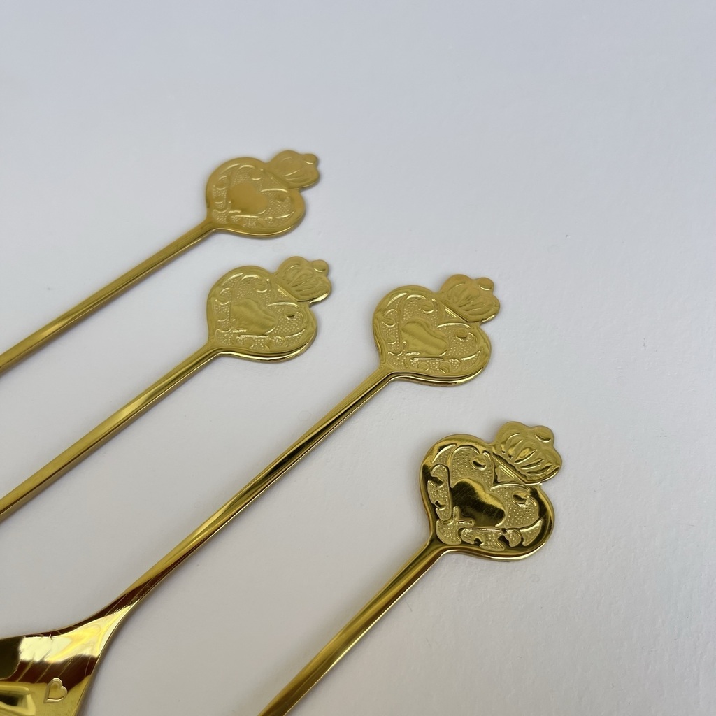 - Kit com 4 colheres de chá douradas, topo com formato coroa.