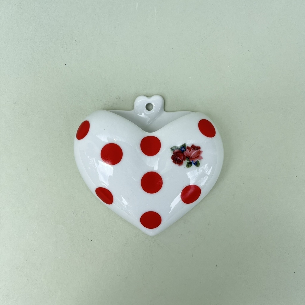 - Vaso de parede lindo, feito em porcelana e em formato de coração com estampas feitas manualmente de pois vermelhos e um mini arranjo de flor aplicado na peça! ♡